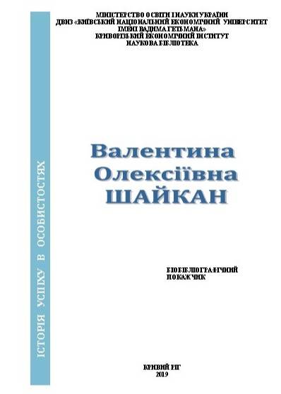 ІСТОРІЯ УСПІХУ В ОСОБИСТОСТЯХ Валентина Олексіївна Шайкан: біобібліографічний покажчик / Криворізький економічний інститут ДВНЗ Київський національний економічний університет імені Вадима Гетьмана»; упоряд. О. О. Картечева. - Кривий Ріг, 2019. - 54 с. (Cерія «Історія успіху в особистостях». Вип. 5) |