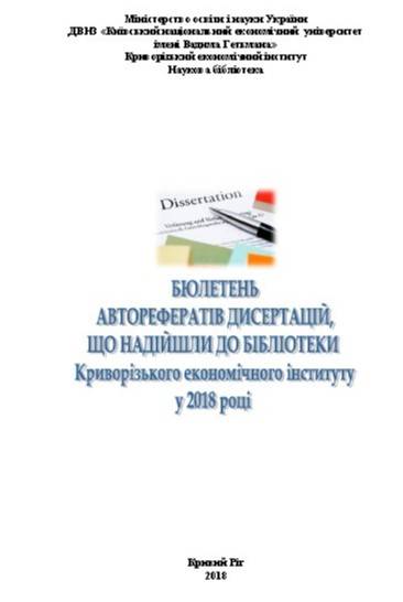 Бюлетень авторефератів дисертацій, що надійшли до бібліотеки Криворізького економічного інституту у 2018 році / укл. С. І. Тимченко.- Кривий Ріг, 2018. - 20 с. |