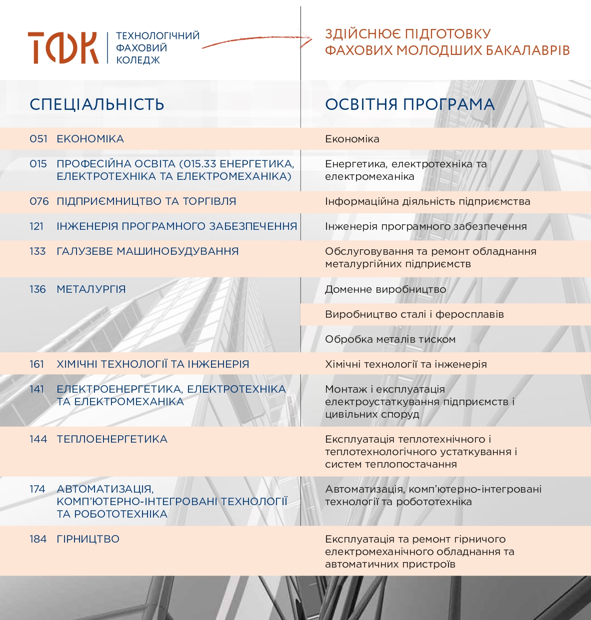 В коледжі здійснюється підготовка спеціалістів на базі 9, 11 класів та професійно-технічних навчальних закладів за денною та заочною формами здобуття освіти за такими спеціальностями: