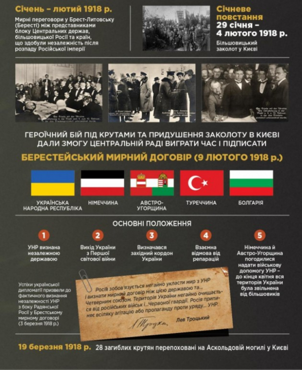 7 січня 1918 року більшовики оголосили загальний наступ на Україну. У середині січня 1918-го вони встановили контроль майже на всьому Лівобережжі та просувалися на Київ. За таких умов 22 січня 1918 року Українська Центральна Рада ІV Універсалом проголосила незалежність Української Народної Республіки.