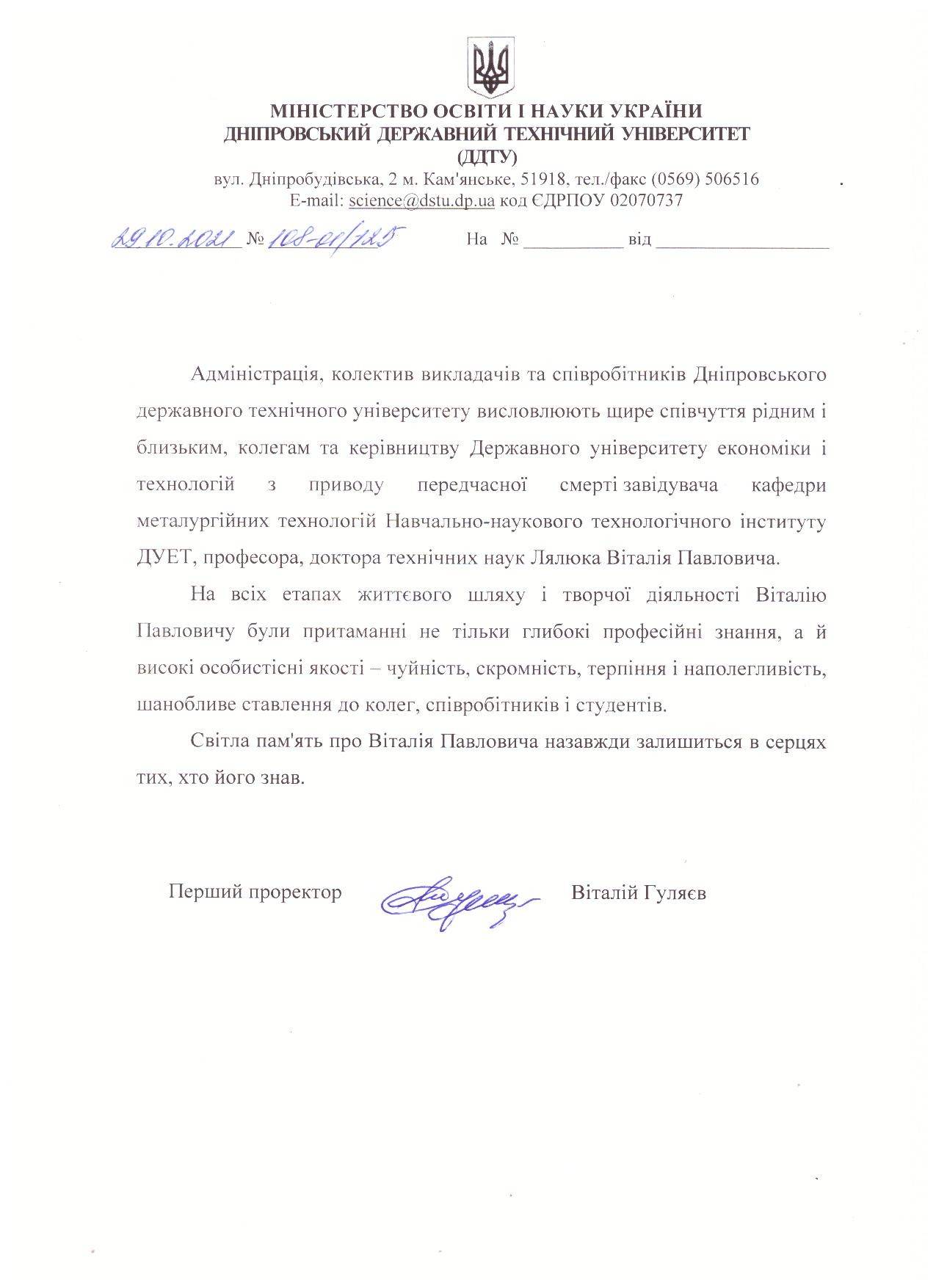 З сумом повідомляємо, що 26 жовтня 2021 року пішов з життя завідувач кафедри металургійних технологій Навчально-наукового технологічного інституту ДУЕТ, доктор технічних наук, професор Лялюк Віталій Павлович.