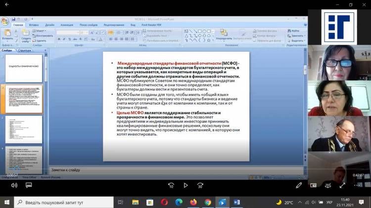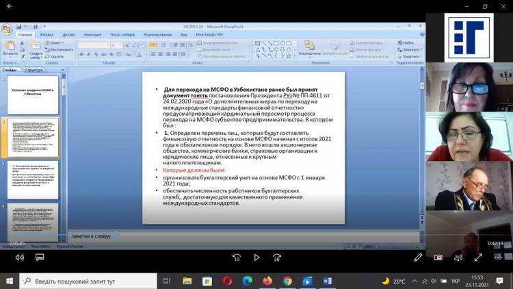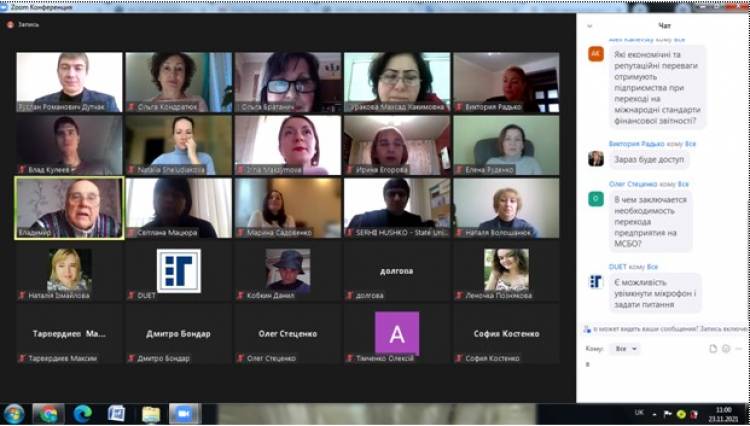 23 листопада 2021 року здобувачі вищої освіти на початковому (короткий цикл), першому (бакалаврському), другому (магістерському) рівнях спеціальностей 051 «Економіка», 071 «Облік і оподаткування», 072 «Фінанси, банківська справа та страхування», 073 «Менеджмент», 076 «Підприємництво, торгівля та біржова діяльність», 291 «Міжнародні відносини,суспільні комунікації та регіональні студії», 292 «Міжнародні економічні відносини» та викладачі університету прийняли участь в гостьовій он-лайн лекції, яка була проведена старшим викладачем кафедри економіки Бухарського державного університету Максад Ураковою на тему «Міжнародні стандарти фінансової звітності».