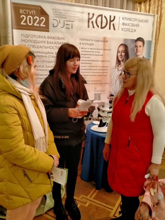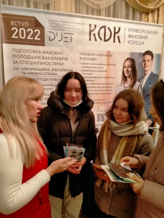 04.02.2022 ВСП «Криворізький фаховий коледж Державного університету економіки і технологій» презентував свою освітню діяльність на щорічному міському профорієнтаційному заході «Ярмарок професій», який відвідали учні 9 та 11 класів з різних районів і шкіл міста.