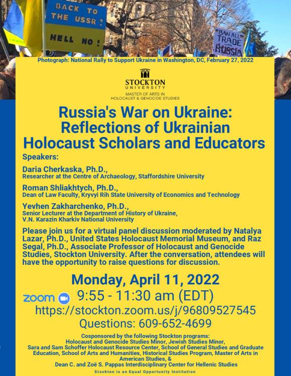 Віртуальна дискусія пройшла 11 квітня 2022 року за підтримки Стоктонського університету та була організована доктором Разом Сігалом зі Стоктонського університету та доктором Наталією Лазар з Меморіального музею Голокосту у Вашингтоні. Серед учасників - в.о. декана Юридичного факультету ДУЕТ Роман Шляхтич. Також спікерами були науковці з Києва та Харкова, які досліджують різні аспекти Голокосту. Основна мета дискусії полягала у тому, щоб донести погляди українських істориків на сучасну російську агресію до американських колег.