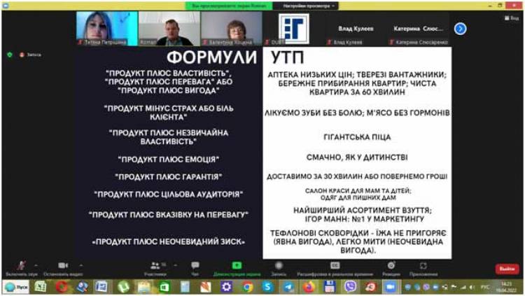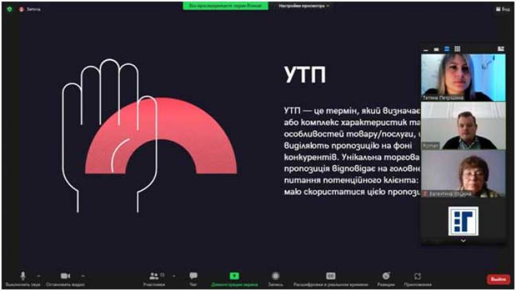 Кафедрою управління бізнесом було проведено вебінар, який був присвячений створенню унікальної торгової пропозиції (УТП), яка допомагає у просуванні брендів з мінімальними витратами. Вебінар пройшов в рамках практичної підготовки здобувачів вищої освіти спеціальностей Маркетинг та Менеджмент 19 квітня 2022 року.