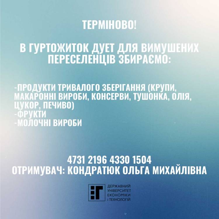 Для вимушених переселенців в гуртожиток ДУЕТ збираємо: