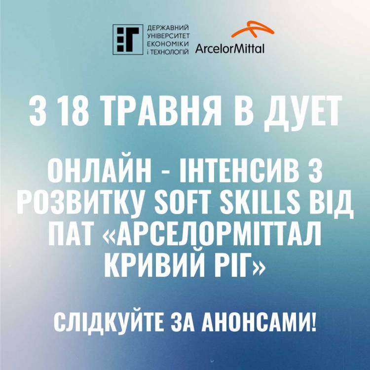 Спільні проєкти, які ми реалізовуємо разом з нашими партнерами для студентів ДУЕТ, тривають незважаючи ні на що. Сьогодні ми раді запросити тебе стати учасником онлайн-інтенсиву з розвитку soft skills від ПАТ "АрселорМіттал Кривий Ріг".
