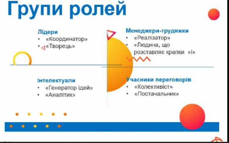 Кожен зі слухачів мав можливість визначити свою його роль у команді завдяки тесту Белбіна. Прості запитання, з яких складається тест, допомагають зрозуміти себе, а також потребу розподіляти роботу між усіма. Наша спікерка запропонувала об'єднати усі ролі у 4 групи: лідери, хвацькі менеджери, інтелектуали та учасники переговорів. Кожен з них займає свою важливу позицію в команді, без якої результат не буде успішним.