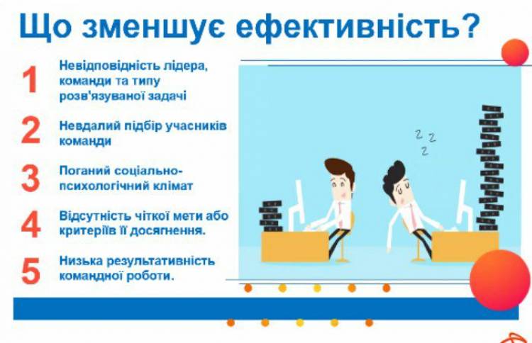 Ефективність команди залежить також й від керівника. Він має не лише спостерігати за процесом роботи, а й створювати сприятливий соціально-психологічний клімат. Наприклад, організовувати team-білдинги, завдяки яким команда більше відкривається одне одному та бачить, що керівник "така як всі, не завжди похмура людина."