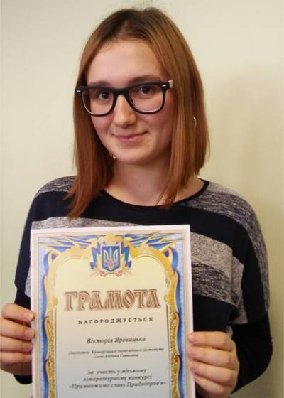 - Я брала участь у конкурсі, коли ще навчалася в 11-му класі ЗСШ № 66. Тоді й написала вірш про рідне місто Кривий Ріг і ось отримала грамоту. Я дуже рада, - говорить Вікторія. – Поезію я дуже люблю.