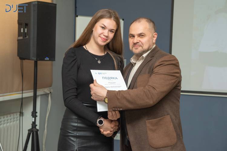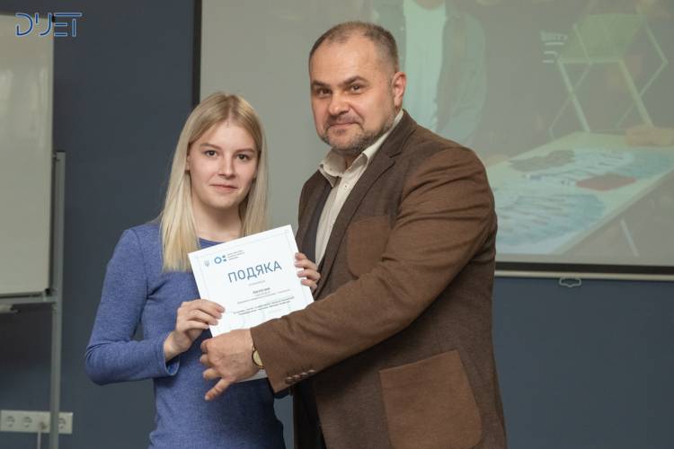 Наші студенти доклали чимало зусиль, щоб ознайомити майбутніх випускників з професіями, котрі можна отримати в інститутах і коледжах ДУЕТ. Валентин Орлов вручив студентам Подяки за профорієнтаційну працю.