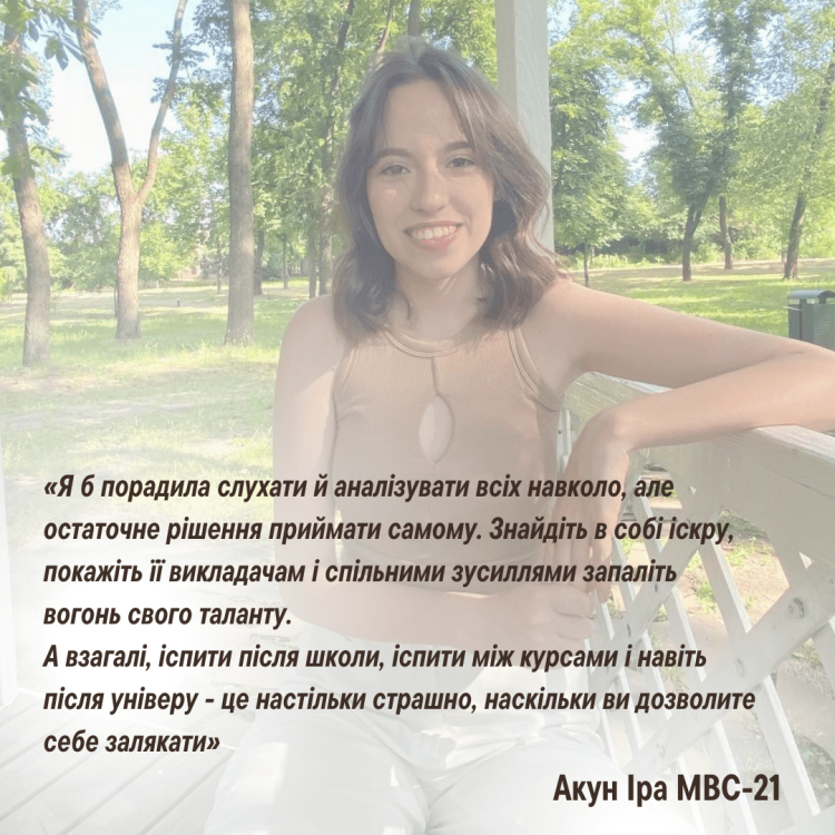 Абітурієнтам я б порадила слухати й аналізувати всіх навколо, але остаточне рішення приймати самому. Знайдіть в собі іскру, покажіть її викладачам і спільними зусиллями запаліть вогонь свого таланту. А взагалі, іспити після школи, іспити між курсами і навіть після універу – це настільки страшно, наскільки ви дозволите себе залякати».