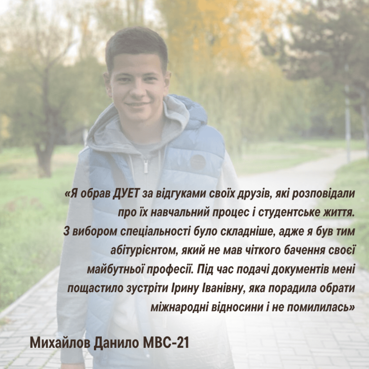 «Я обрав ДУЕТ за відгуками своїх друзів, які розповідали про навчальний процес і студентське життя тут. З вибором спеціальності було складніше, адже я був тим абітурієнтом, який не мав чіткого бачення своєї майбутньої професії. На щастя, під час подачі документів мені пощастило зустріти Ірину Максимову, яка порадила обрати міжнародні відносини. Я дослухався і не помилився».