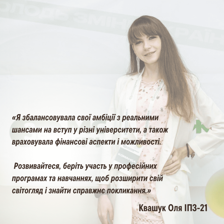 Бажання здобути якісну освіту та мати можливості для розвитку і кар’єрного зростання були важливими чинниками під час вибору навчального закладу. Крім того, я була реалістичною і враховувала мої академічні досягнення та можливості. Я збалансовувала свої амбіції з реальними шансами на вступ у різні університети, а також враховувала фінансові аспекти й можливості. Усі ці фактори допомогли мені прийняти розумні рішення та розставити пріоритети під час вступної кампанії.