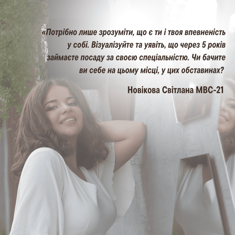 «Потрібно лише зрозуміти, що є ти й твоя впевненість у собі. Візуалізуйте та уявіть, що через 5 років обіймаєте посаду за своєю спеціальністю. Чи бачите ви себе на цьому місці, у цих обставинах? Чи насправді ви хочете весь час комунікувати з людьми або працювати за комп’ютером та паперами? Зараз у 21 столітті ви не маєте меж у своєму виборі та можете зупинитись в будь-який момент і змінити напрям своєї діяльності, або вивчати щось паралельно. Щодо визначення пріоритетів, то враховуйте яку форму навчання ви розглядаєте для себе: контракт або виключно бюджет. Я також вважаю, що все залежить не від місця розташування університету, а від твоєї жаги до знань та ставлення до навчання. Мені подобається, що в ДУЕТ є свобода вибору, викладачі прислухаються до думки студентів у моментах навчального плану та організації освітнього процесу».