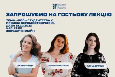 Запрошуємо студентство Державного університету економіки і технологій 18.10.2023 о 13:00 на онлайн-зустріч від представників Української асоціації студентів для здобувачів освіти, за ініціативи кафедри публічного управління та адміністрування ДУЕТ.