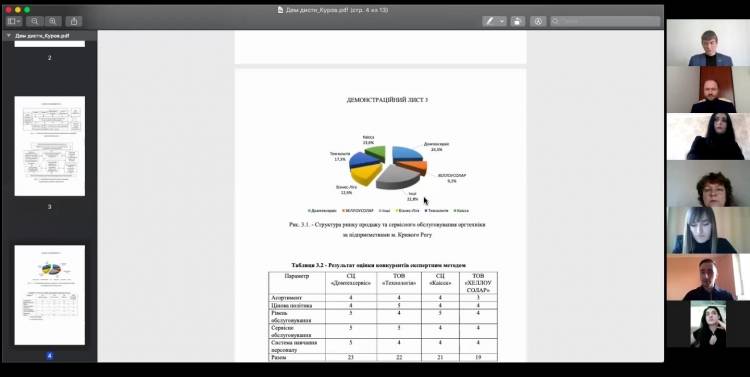 Усі допущені до захисту студенти були присутні та презентували результати своїх досліджень у галузі управління маркетинговою діяльністю підприємства, управління товарною, комунікаційною політикою тощо. Доповіді здобувачів ґрунтувались на уявленні головних аспектів та висновків по роботі, ілюстраційний матеріал презентувався за допомогою функції «демонстрація екрану». Під час захисту здобувачі показали вміння презентувати результати, аргументувати, брати участь в науковій дискусії в такому незвичному для них режимі. Таким чином, як справжні маркетологи 21 століття, студенти проявили вміння швидко адаптуватися до навколишніх змін та проявляти свої кращі якості в нових умовах.