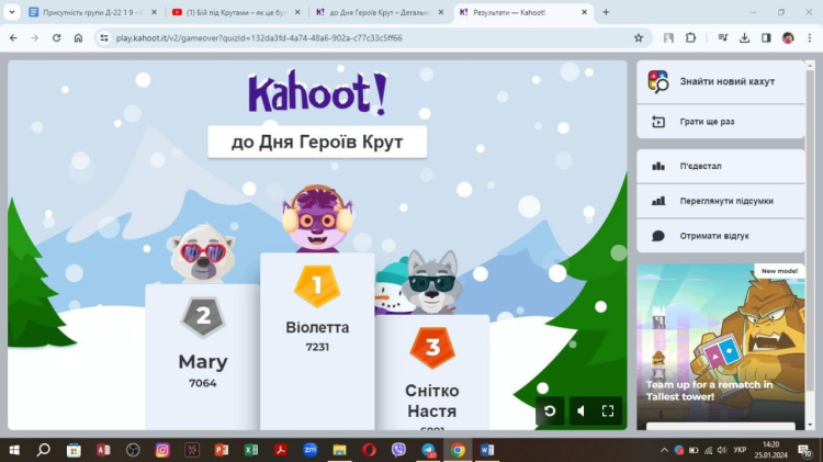 Закріпили ці знання студенти за допомогою вікторини у Кахут, а в серцях – повага і нескінченна вдячність нашим українцям і їхньому подвигу...