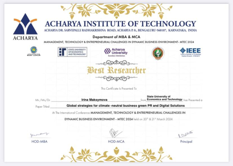 За результатами міжнародної конференції MANAGEMENT, TECHNOLOGY & ENTREPRENEURIAL CHALLENGES IN DYNAMIC BUSINESS ENVIRONMENT - MTEC 2024, яка відбулася 20-21 березня в Індії, науковці ДУЕТ Ірина Максимова і Тетяна Петрішина здобули перемогу в номінації за найкраще наукове дослідження.