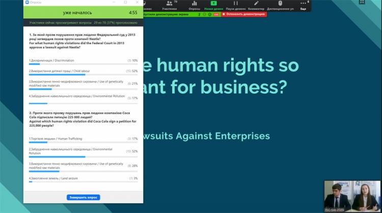 Питання впливу індустріальних корпорацій на права людини та проблеми, з якими стикаються сучасні промислові кампанії, розкрила студентка Hanna Demchenko. Проблематиці захисту персональних даних, шляхам удосконалення законодавства у сфері електронної комерції та інтернет-торгівлі були присвячені доповіді таких студентів: Karolina Berkun, Dasha Dziuba, Bogdan Nechepurenko, Ilia Giorgadze.