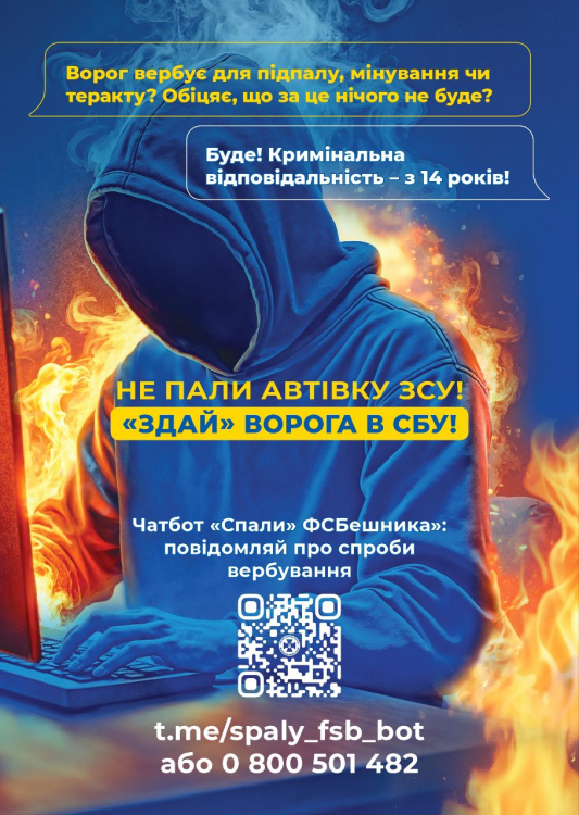 Якщо ворог хоче завербувати через telegram або інші ресурси тебе або твоїх близьких, пропонує палити авто ЗСУ чи адмінбудівлі, влаштувати теракт чи мінування, одразу пиши до офіційного чатботу СБУ, який допоможе врятувати життя багатьох українців.