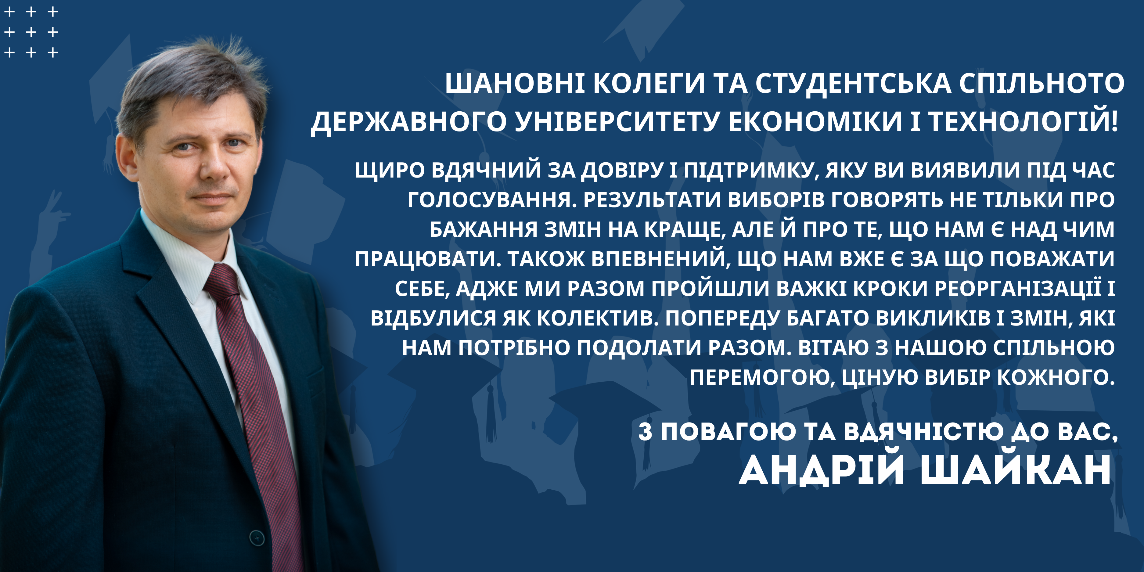Щиро вдячний за довіру і підтримку, яку ви виявили під час голосування. Результати виборів говорять не тільки про бажання змін на краще, але й про те, що нам є над чим працювати. Також впевнений, що нам вже є за що поважати себе, адже ми разом пройшли важкі кроки реорганізації і відбулися як колектив. Попереду багато викликів і змін, які нам потрібно подолати разом. Вітаю з нашою спільною перемогою, ціную вибір кожного.