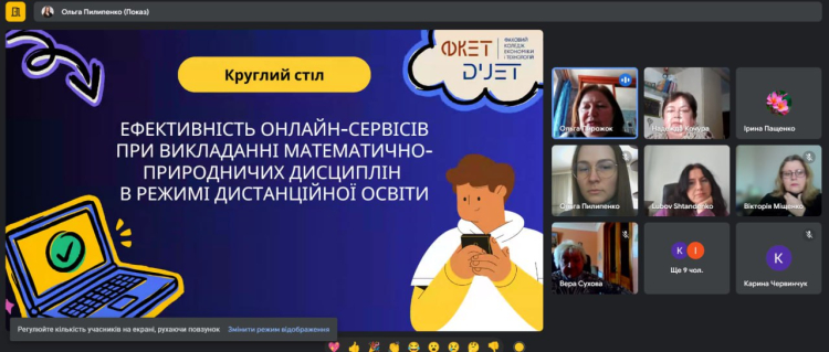 27 лютого 2025 року в межах Регіонального методичного об’єднання викладачів математично-природничого циклу закладів фахової передвищої освіти Північного регіону міста Кривого Рогу на базі ВСП «Фаховий коледж економіки і технологій ДУЕТ» відбувся круглий стіл на тему «Ефективність онлайн-сервісів при викладанні математично-природничих дисциплін в режимі дистанційної освіти».