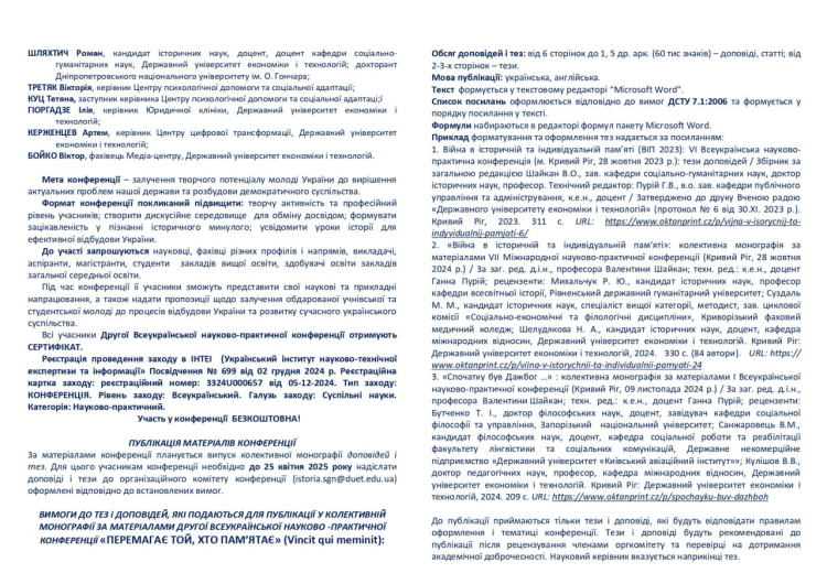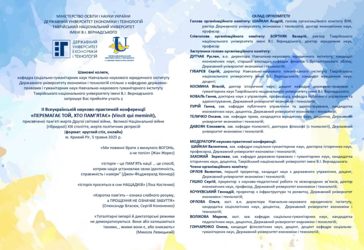 Кафедра соціально-гуманітарних наук Навчально-наукового юридичного інституту Державного університету економіки і технологій спільно з кафедрою державно-правових і гуманітарних наук Навчально-наукового гуманітарного інституту Таврійського національного університету імені В.І. Вернадського запрошує взяти участь у IІ Всеукраїнській науково-практичній конференції «ПЕРЕМАГАЄ ТОЙ, ХТО ПАМ'ЯТАЄ» (Vincit qui meminit), присвяченій пам'яті жертв Другої світової війни, Великої Національної війни (гібридної) ХХІ століття, жертв політичних репресій