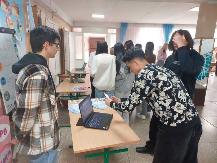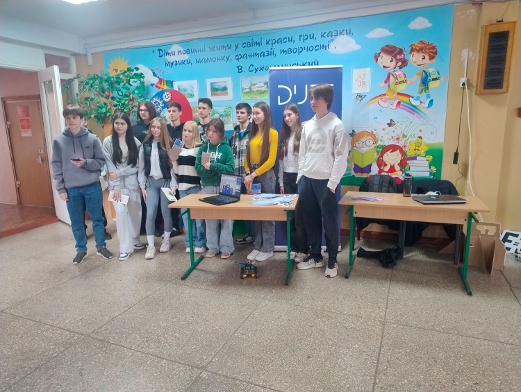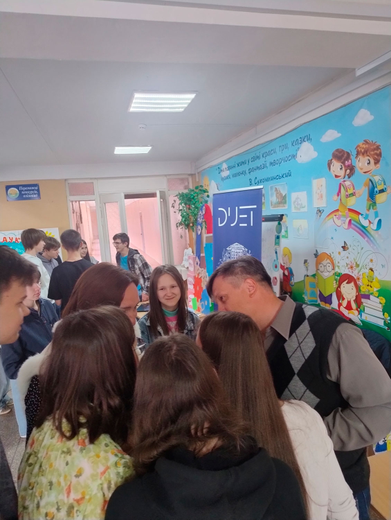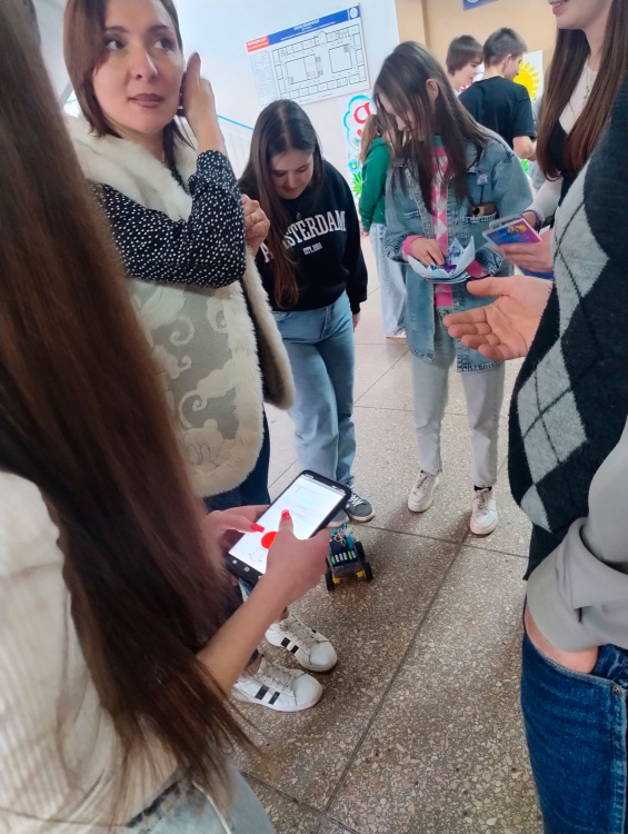 Найбільшу зацікавленість до роботи гуртка та стендів, що демонстрували успіхи студентів у освоєнні елементної бази та вивченні алгоритмів роботи всіляких пристроїв, проявив 11-Б. І це цілком закономірно, тому що класний керівник, Карпенко Оксана Дмитрівна, у 11-Б. – вчитель інформатики. І вона вміє надихнути своїх учнів на творчий пошук. Спілкування вийшло цікавим і насиченим: учням було «що запитати», а студентам було «що відповісти».