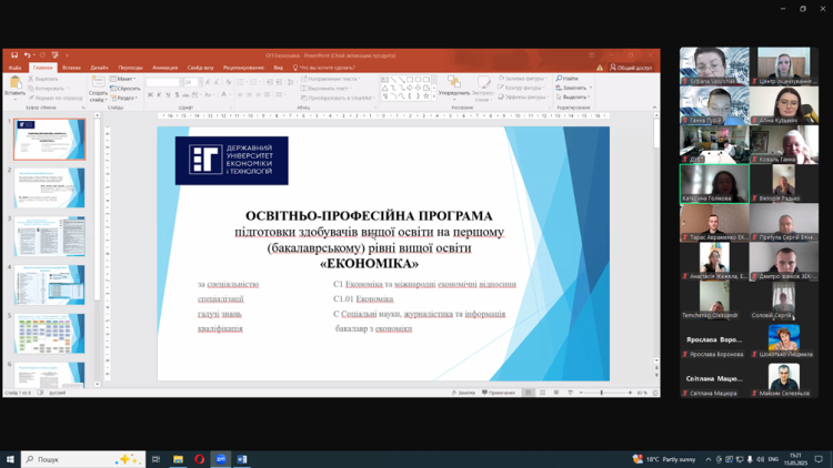 15 травня 2025 року о 15-00 відбулося обговорення проєкту освітньо-професійної програми підготовки здобувачів вищої освіти «Економіка» за спеціальністю С1 Економіка та міжнародні економічні відносини спеціалізації С1.01 Економіка галузі знань С Соціальні науки, журналістика та інформація та змін до освітньо-професійної програми «Економіка» за спеціальністю 051 Економіка галузі знань 05 Соціальні та поведінкові науки на першому (бакалаврському) рівні вищої освіти. Громадське обговорення пройшло у змішаному форматі: очно – в приміщенні Університету (пл. Захисників України,2) та дистанційно з використанням платформи Zoom під відеозапис. Засідання вела завідувач Центру ліцензування та акредитації Державного університету економіки і технологій Сергєєва Наталія Анатоліївна.