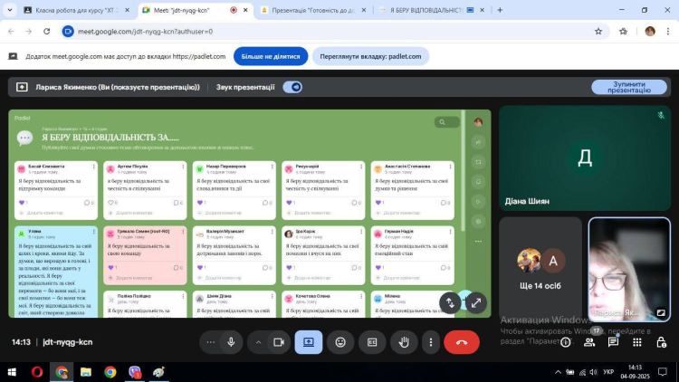Кожен студент завершив заняття висловлюванням : « Я беру відповідальність за…»