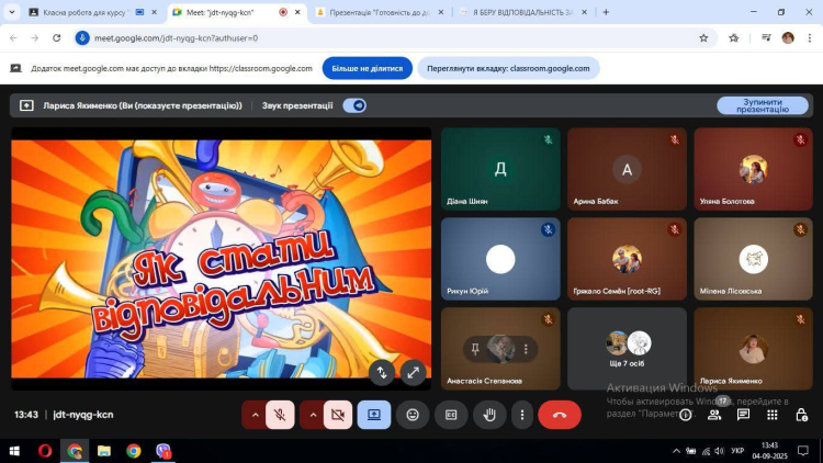 Вирішуючи ситуаційні завдання, обґрунтовуючи вислови про високу й низьку відповідальність, розбираючи свій рівень відповідальності, дійшли до висновку, що треба шукати можливості до самовдосконалення й не звертати увагу на перешкоди, а також вчитись відповідати за свої вчинки й наміри.