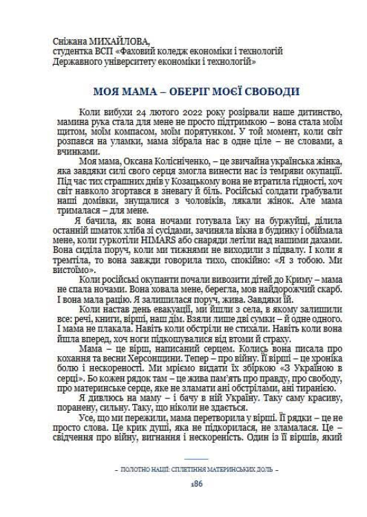 У вересні 2025 року Науково-методичний центр ЗФПО презентував третю частину напрацювань «Полотно нації: сплетіння материнських доль», до створення якої долучилася й студентка нашого коледжу — Михайлова Сніжана, студентка ІІ курсу спеціальності «Харчові технології». Вона представила свою роботу «Моя мама — оберіг моєї свободи», у якій розповіла про свою маму — Колісніченко Оксану — та поділилася її віршем «Переселенець».