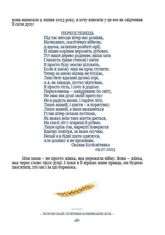 Цей збірник — не просто слова на папері. Це нитки живої пам’яті, що сплітаються у велике національне полотно болю, гідності, любові та жертовності. Кожне есе тут — це частинка серця матері, яка втратила найдорожче, але не втратила віри у силу добра, справедливість і незламність українського духу.