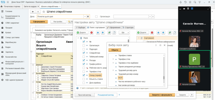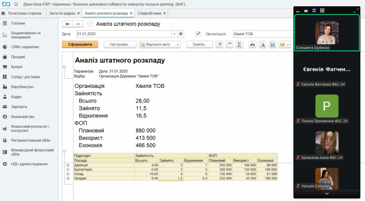 ФІНАЛ ЗАНУРЕННЯ: Ми всі ці дані відобразили у програмі BAS ERP, а потім перевірили результат за допомогою кадрових звітів (як от «Аналіз штатних співробітників»)! Студенти відчули колосальний обсяг інформації, який знає кадровик, та чим він керується, щоб система працювала коректно.