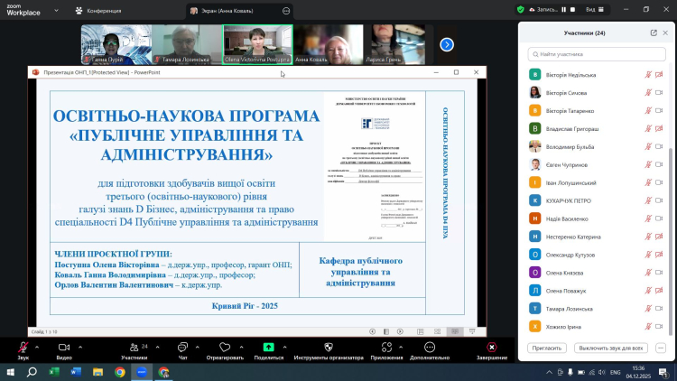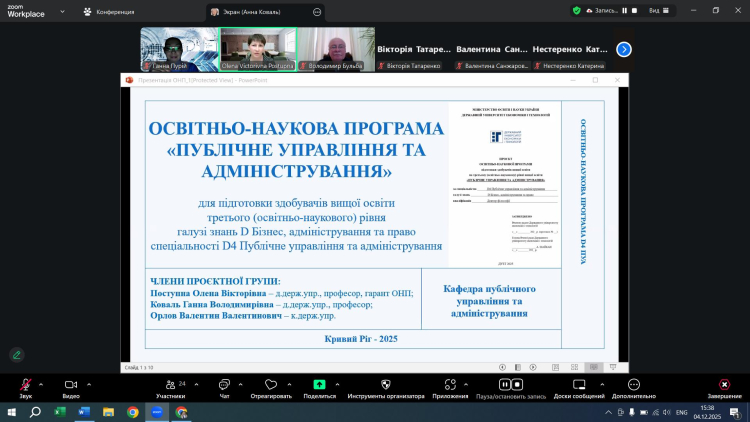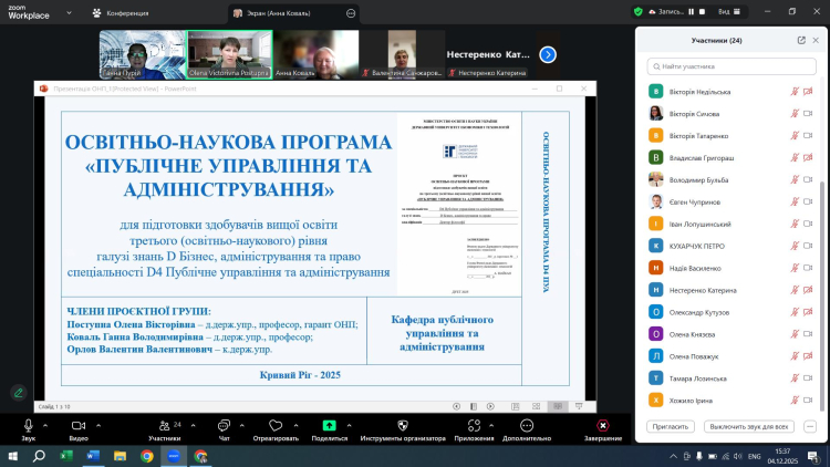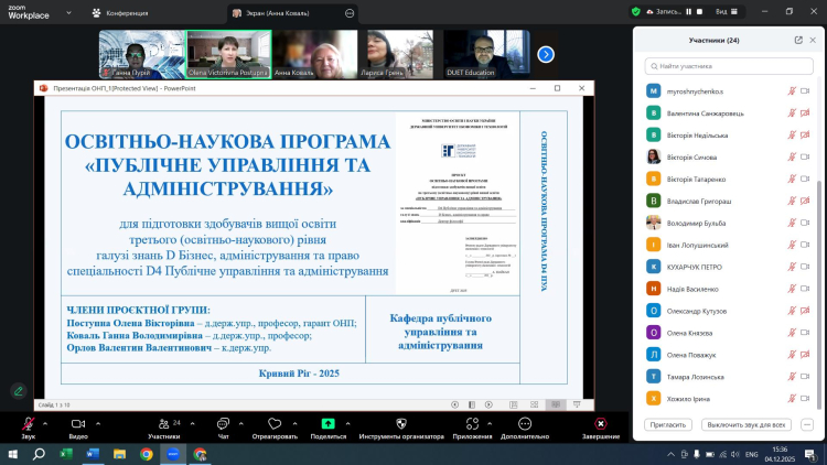 4 грудня 2025 року о 15-30 відбулося обговорення проєкту освітньо-наукової програми (ОНП) «Публічне управління та адміністрування» з підготовки здобувачів вищої освіти третього (освітньо-наукового) рівня, ступеня доктора філософії у галузі знань D Бізнес, адміністрування та право спеціальності D4 Публічне управління та адміністрування, за участі стейкхолдерів – представників академічного середовища та практиків.