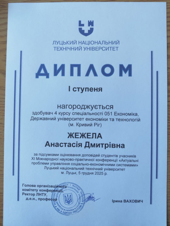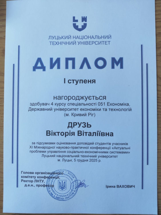 Здобувачки 4 курсу спеціальності 051 «Економіка» – Аліна Лавріненко, Анастасія Жежела та Вікторія Друзь – гідно представили ДУЕТ на XI Міжнародній науково-практичній конференції «Актуальні проблеми управління соціально-економічними системами», що відбулася 5 грудня 2025 року на базі Луцького національного технічного університету.