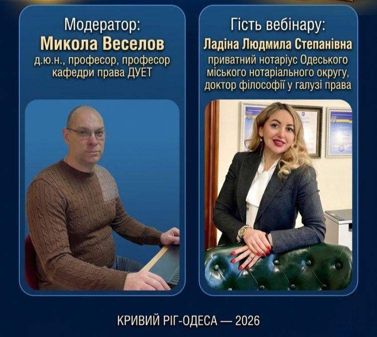 Для здобувачів першого (бакалаврського) та другого (магістерського) рівня освіти кафедрою права Навчально-наукового юридичного інституту ДУЕТ був організований та проведений вебінар-зустріч з практикуючим приватним нотаріусом Одеського міського нотаріального округу, доктором філософії у галузі права Людмилою Ладіною. Модератором вебінару виступив професор кафедри права ДУЕТ Микола Веселов.