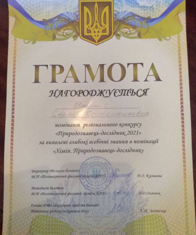 Конкурс проходив у кілька етапів: "Знайомство", "Хімічні перегони", "Хімія в танці", "Чарівна", "Знайди пару". За результатами конкурсу студент групи МЕП-20-1/9 Сергій Олійник виявився найкмітливішим і отримав грамоту в номінації "Хімія. Природознавець-дослідник".