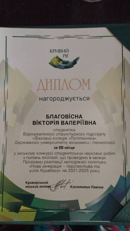 24 травня студентка Відокремленого структурного підрозділу «Фаховий коледж «Політехніка» Державного університету економіки і технологій» Благовісна Вікторія взяла участь у ювілейному міському конкурсі студентських наукових робіт з екології, що проводився в межах Програми реалізації молодіжної політики «Нова генерація – перспектива та успіх Кривбасу» на 2021-2025 роки.
