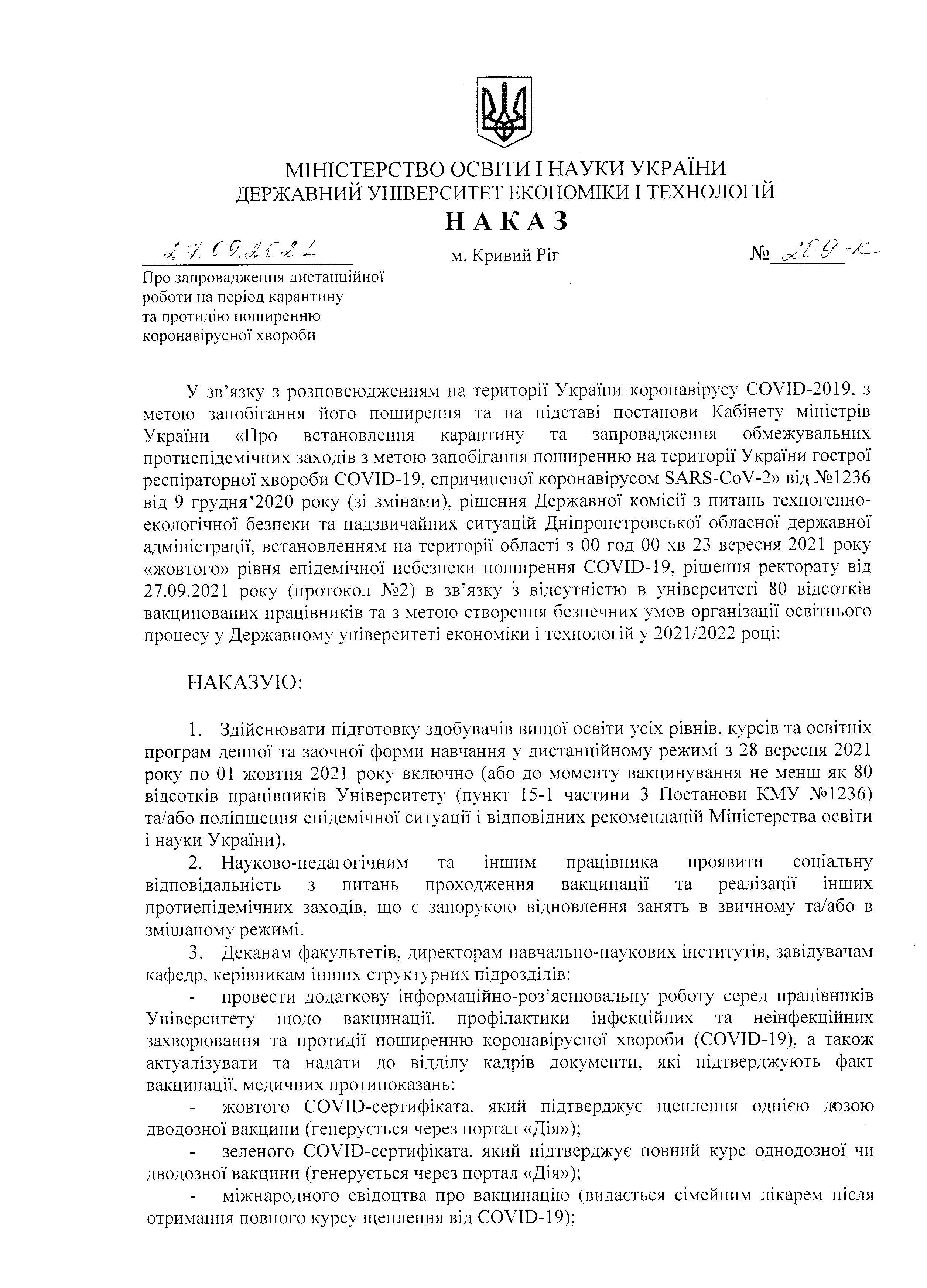 НАКАЗ "Про запровадження дистанційної роботи на період карантину та протидію поширенню коронавірусної хвороби" від 27.09.2021