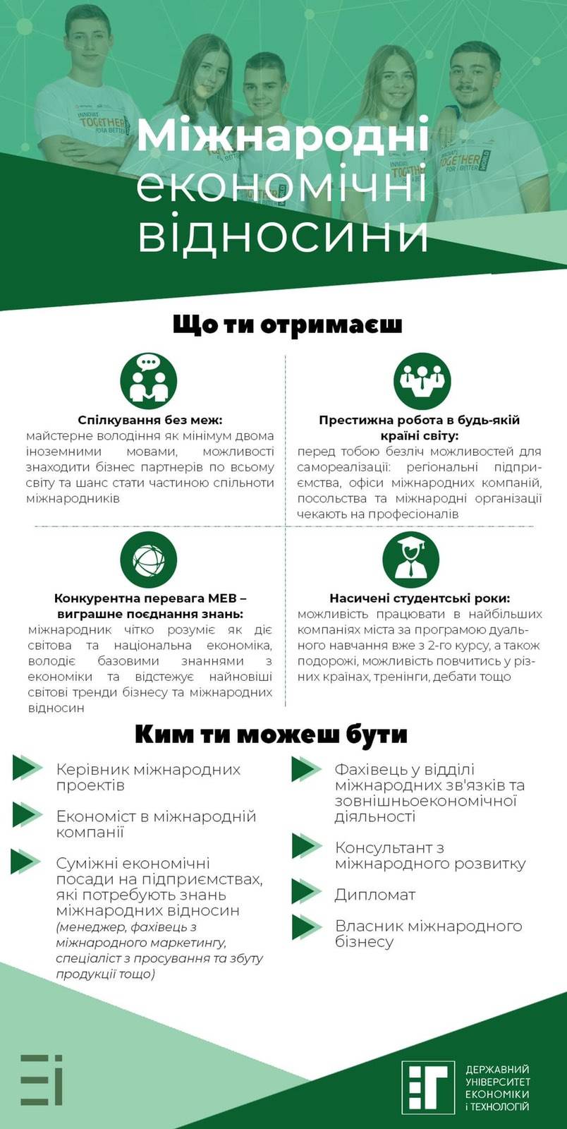 «Міжнародні економічні відносини» - це престижна спеціальність з широкими можливостями! Ви навчитеся відчувати та глибоко розуміти усі економічні процеси сучасного світу, поведінку гравців великого бізнесу, стратегії розвитку національних компаній на міжнародній арені, корпоративну культуру та бізнес процеси міжнародних корпорацій, динаміку світових ринків, міжнародні фінансові системи, перспективи політичних, економічних та дипломатичних відносин між державами та об’єднаннями.