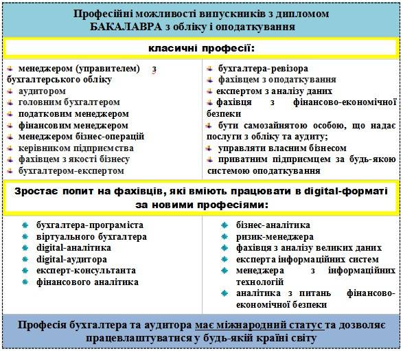 Робота фахівців з обліку і оподаткування є незамінною складовою бізнесу. Вони можуть працювати за суміжними професіями, оскільки мають універсальні знання: з бухгалтерського обліку, аналізу, аудиту контролю і оподаткування; з ІТ- технологій; економіста зовнішньоекономічної діяльності; фінансиста; юриста; менеджера; з судово-бухгалтерської експертизи, з фінансово-економічної безпеки.
