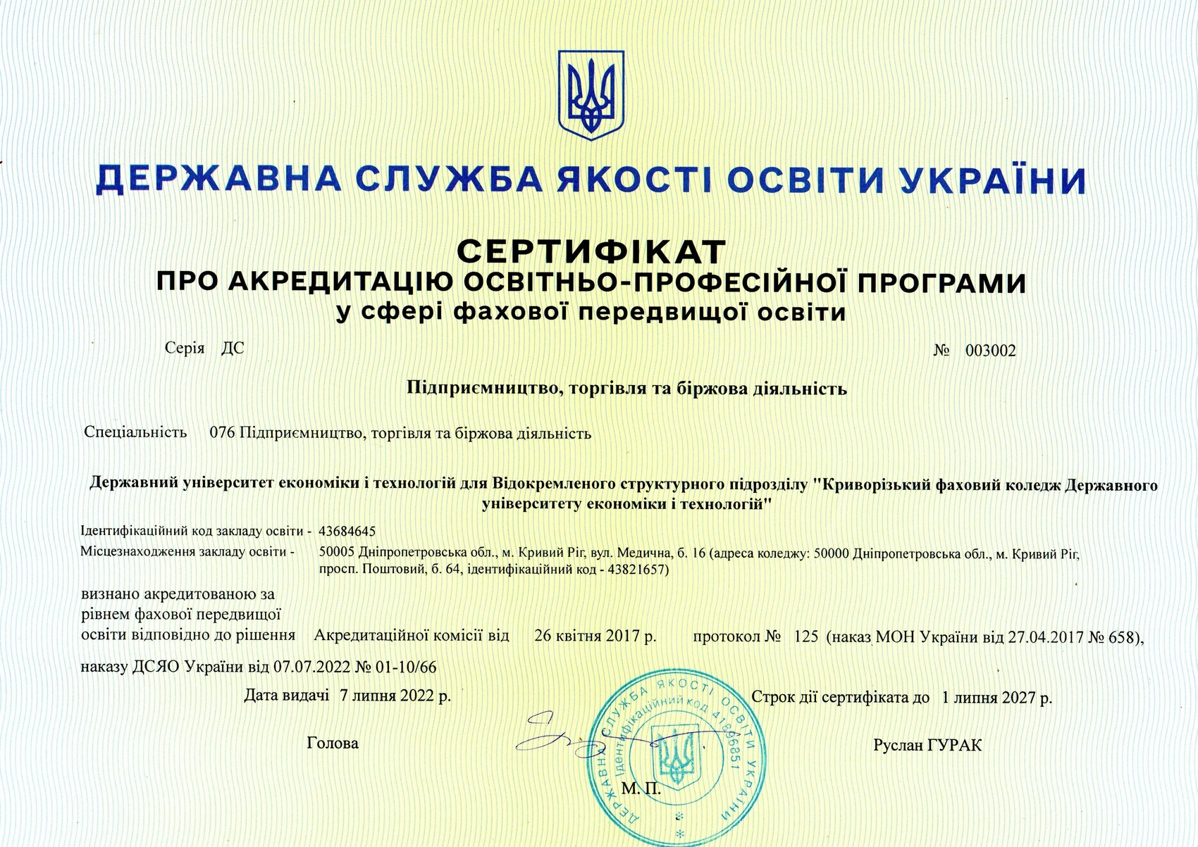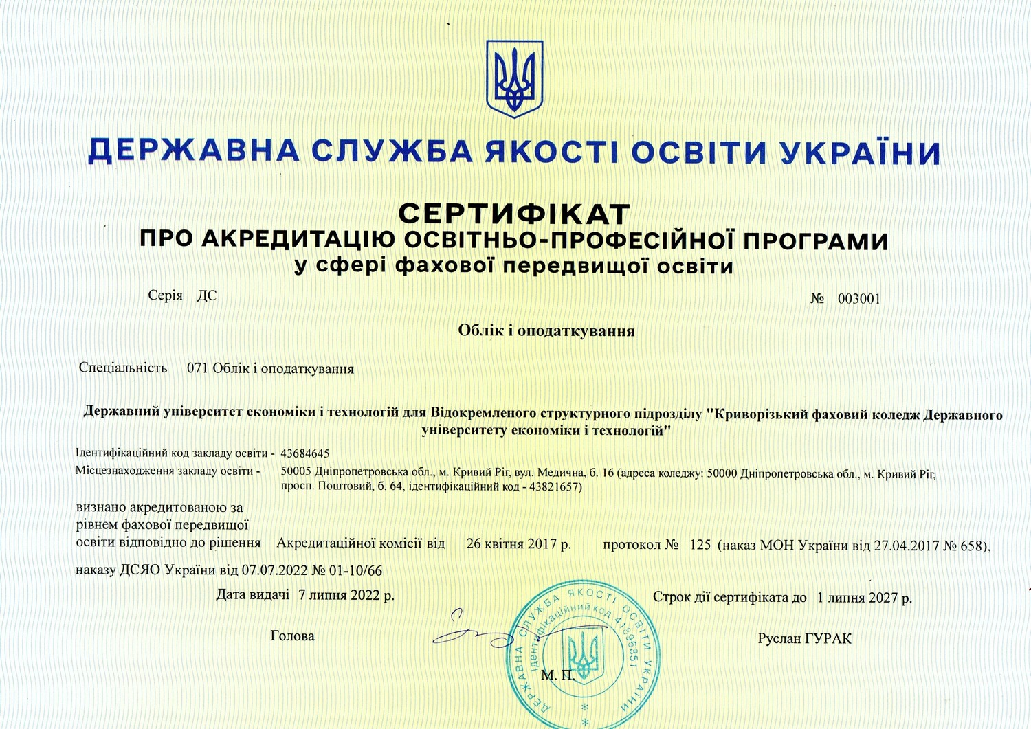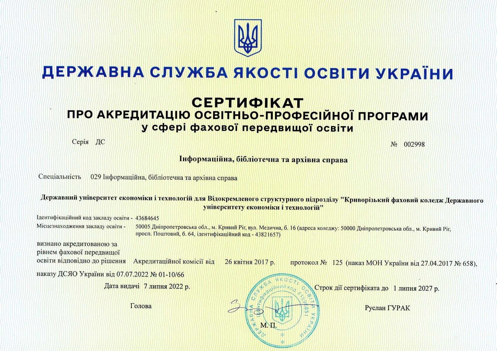 Відомості щодо права здійснення освітньої діяльності у сфері фахової передовищої освіти: