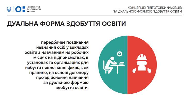 Дуальна форма здобуття освіти - це спосіб здобуття освіти, що передбачає поєднання навчання осіб у закладах освіти з навчанням на робочих місцях на підприємствах для набуття певної кваліфікації, як правило, на основі договору про здійснення навчання за дуальною формою здобуття освіти.
