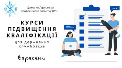Центр кар’єрного та професійного розвитку ДУЕТ оголошує набір слухачів на курси підвищення кваліфікації для державних службовців на вересень 2023 року.