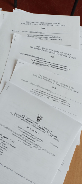 Щорічно за графіком освітнього процесу в березні відбувається атестація здобувачів третього (освітньо-наукового) рівня вищої освіти. Цього року в Державному університеті економіки і технологій вперше пройшли атестацію аспіранти трьох кафедр: кафедри економіки та цифрового бізнесу, кафедри управління бізнесом та кафедри інжинірингу з галузевого машинобудування. Майбутні доктори філософії оформили Звіти про виконання освітньо-наукової програми на третьому (освітньо-науковому) рівні вищої освіти за перше півріччя 2023-2024 навчального року, у яких відображено виконання наукової і освітньої складової підготовки доктора філософії, відомості про апробацію результатів дослідження.