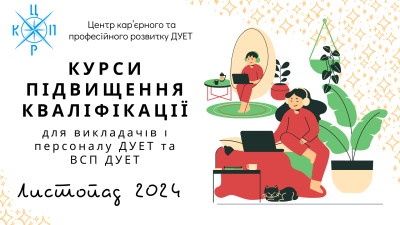 Центр кар’єрного та професійного розвитку ДУЕТ оголошує набір слухачів на курси підвищення кваліфікації для науково-педагогічних працівників закладів вищої освіти та фахової передвищої освіти та персоналу на листопад 2024 року.