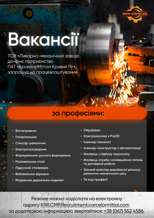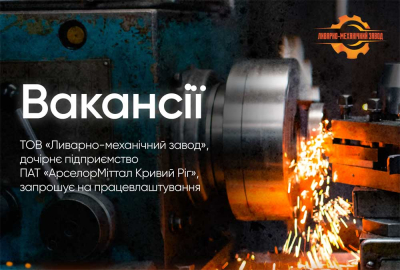 ТОВ «ЛИВАРНО-МЕХАНІЧНИЙ ЗАВОД» (дочірнє підприємство ПАТ «АрселорМіттал Кривий Ріг») запрошує молодих та амбітних фахівців для працевлаштування!