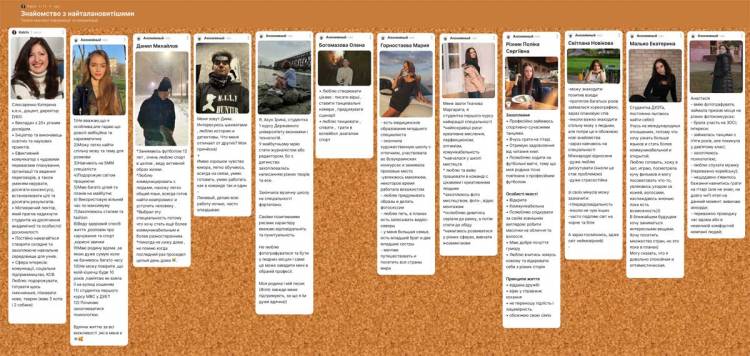 Зі студентами першого курсу ОП «Міжнародна інформація та журналістика» цей інструмент ми використали для того, щоб познайомитися один з одним. В такий спосіб кожен з учасників надав коротку інформацію про себе: освіту, захоплення, мрії, про свої переваги.